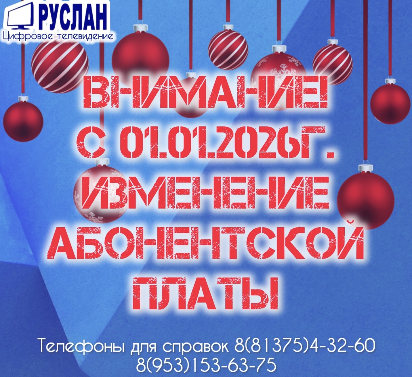 ООО «РУСЛАН» приглашает Вас стать абонентами кабельного телевидения! С нами Вы сможете просматривать 54 канала в аналоговом формате и более 100 каналов в цифровом и HD формате.