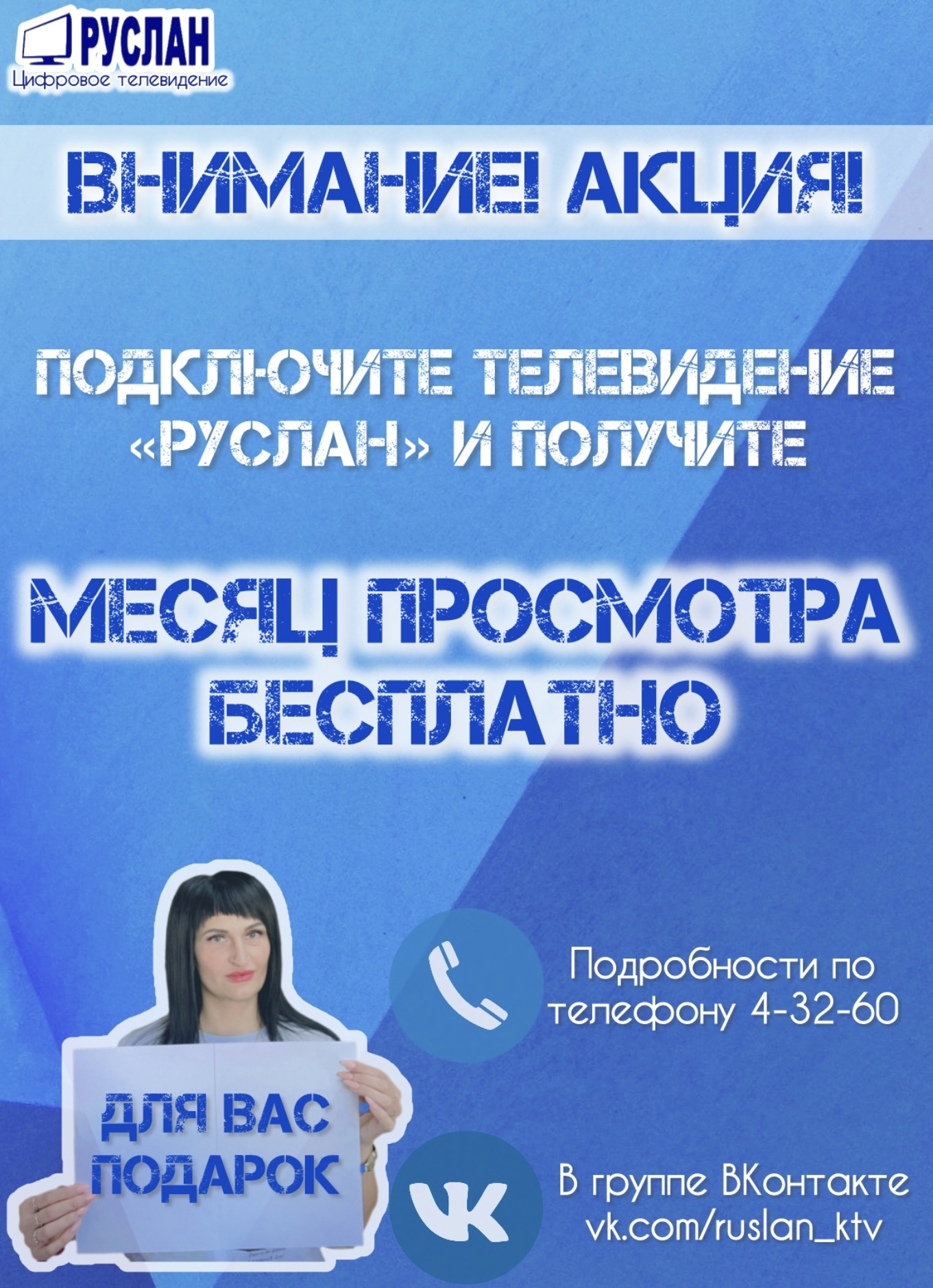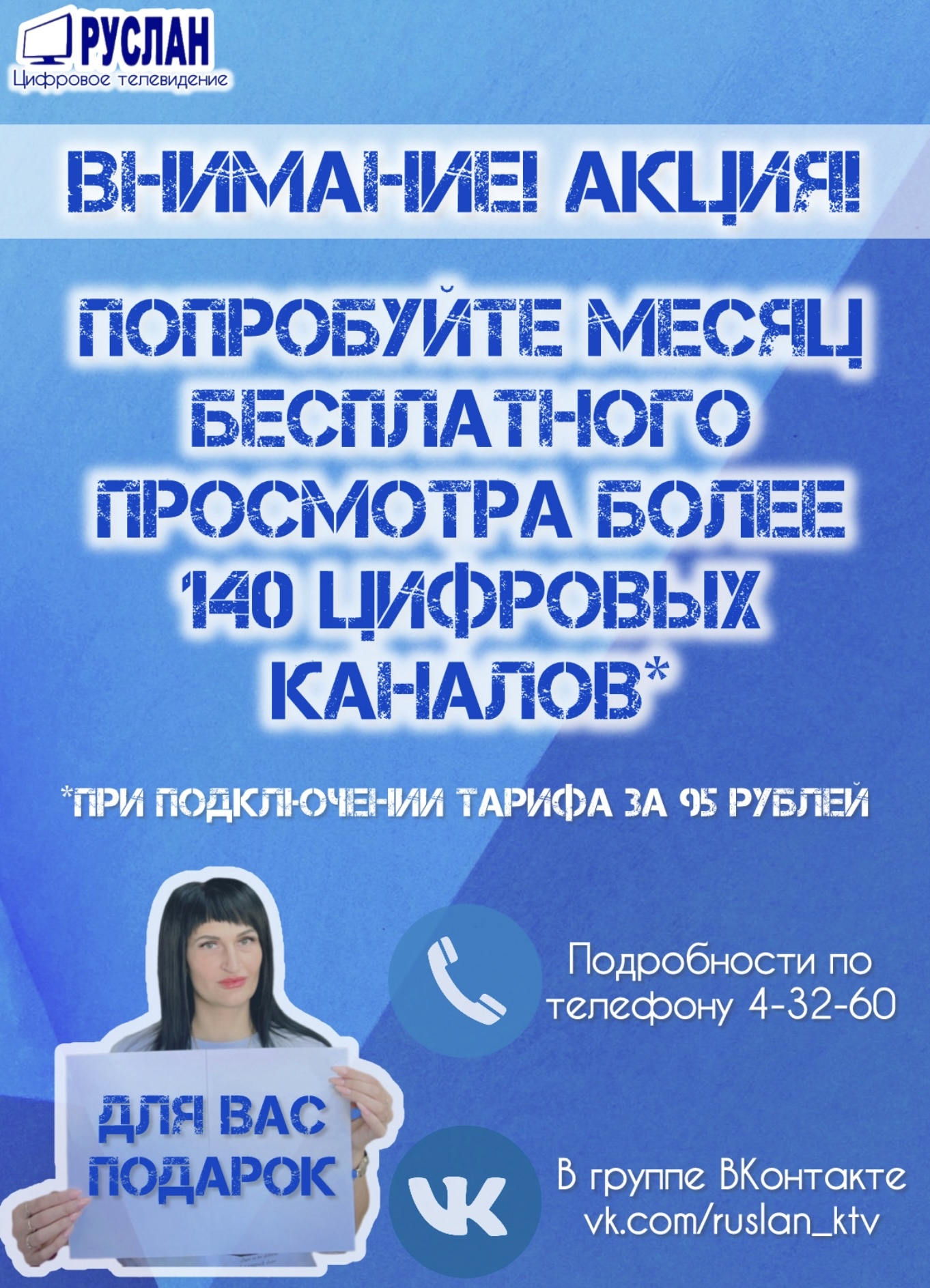 ООО «РУСЛАН» приглашает Вас стать абонентами кабельного телевидения! С нами Вы сможете просматривать 54 канала в аналоговом формате и более 100 каналов в цифровом и HD формате.